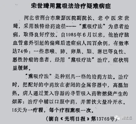 这种独特的疗法,曾有一位名叫宋世琦的民间中医能熟练的使用它,他还撰写了一本《宋氏熏吸疗法》的书,介绍该疗法。可惜的是这本书现在已经绝版,我曾到处寻找,未能找到,一直抱憾。希望藏有这本书的读者,能够复印一份给笔者做研究用,不胜感激。